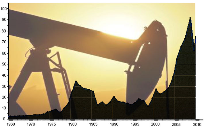Der Kurvenverlauf zeigt den für jedes Jahr gemittelte Jahresdurchschnittspreis für Rohöl auf dem Weltmarkt (Datenmaterial IEA und OPEC) in US $ / Barrel.
